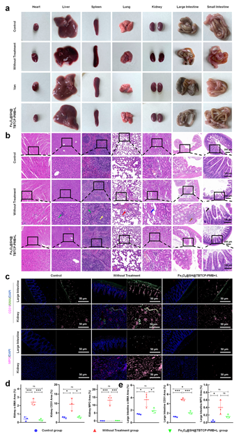 基于以上研究,该团队利用磁性纳米颗粒(NPs)独特的病原体富集与捕获能力,以及磁性分离特性,成功规避了与血液循环和代谢相关的问题,制备了一种聚集诱导发光光敏剂武装的磁性纳米颗粒,Fe3O4@SH@TBTCP-PMB,用于治疗败血症。磁性NPs和PDT的协同作用为败血症治疗提供了有效的解决方案,为进一步解决光敏药物或抗菌材料在败血症治疗过程中对耐药细菌捕获能力不足以及长期血液循环和代谢困难等问题提供理论指导。该工作以“Aggregation-Induced Emission Photosensitizer-Armored Magnetic Nanoparticles for Sepsis Treatment: Combating Multidrug-Resistant Bacteria and Alleviating Inflammation”为题发表在《Advanced Functional Materials》上。伟德官网为本论文的通讯单位,文章第一作者是伟德官网博士生王嘉莉,通讯作者是吴明雨和封顺教授。该研究得到国家自然科学基金委的支持(22177094,22174117)。