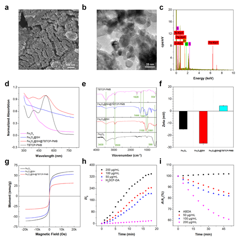 充分利用磁性纳米颗粒和AIE PS的独特属性,开发AIE PS武装的磁性纳米颗粒, Fe3O4@SH@TBTCP-PMB(图1)。这种创新的纳米复合物具有显著的超顺磁性,高效产生ROS的能力,和带正电的特性(图2),阳离子光敏剂增强了磁性纳米材料通过静电相互作用捕获细菌的能力,磁分离的性能可以有效规避光敏剂通过血液循环导致的潜在毒性。