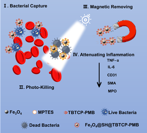 图5 Fe3O4@SH@TBTCP-PMB用于治疗败血症