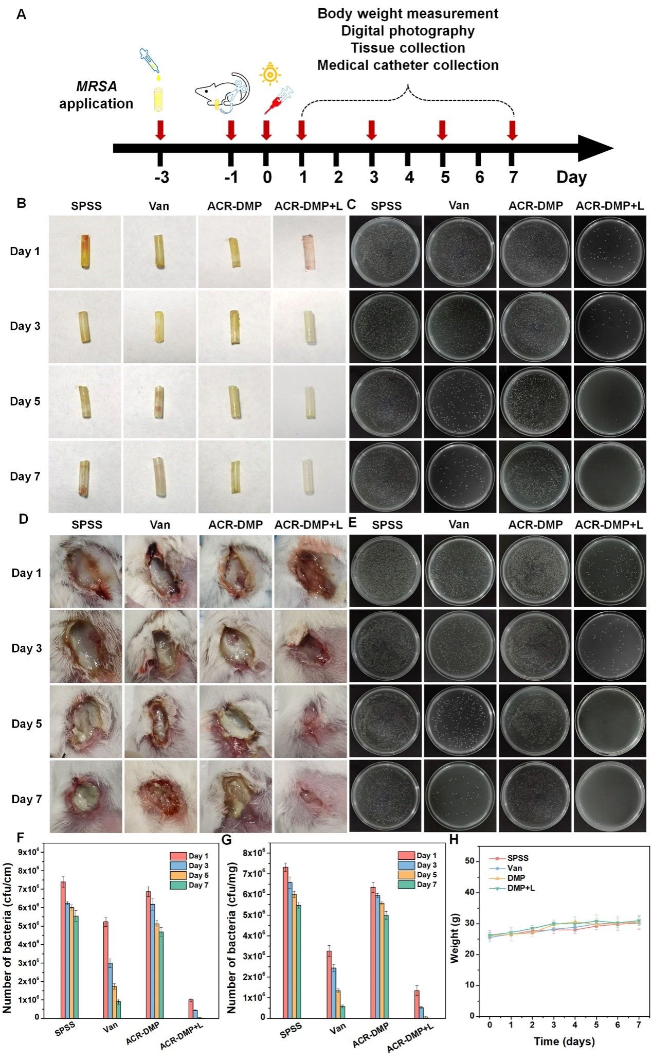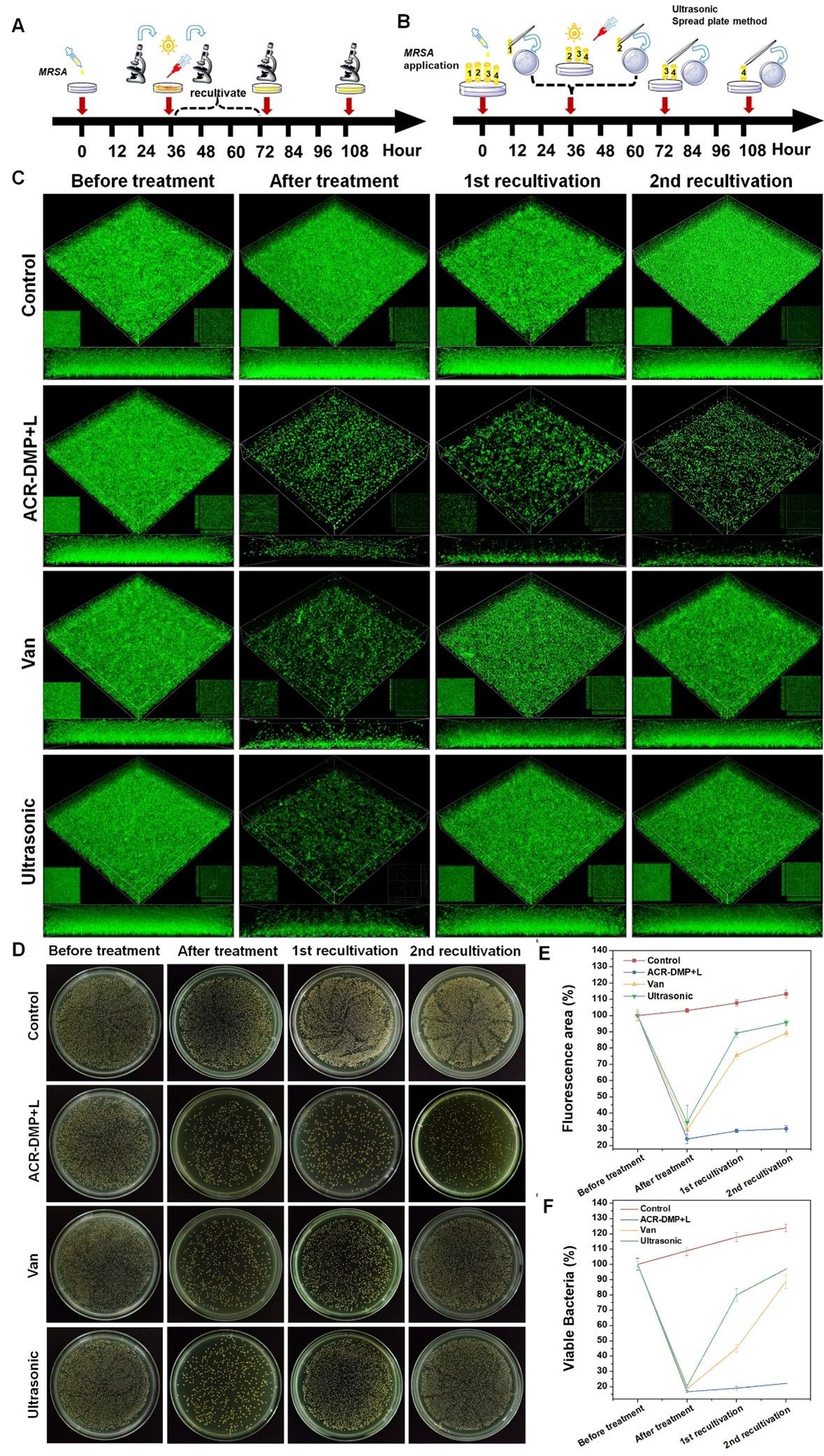 为了验证ACR-DMP具有抑制生物膜复发感染的能力,对万古霉素(Van)、物理刺激(超声处理)和PS处理后的生物膜进行两次再培养,发现ACR-DMP处理后明显降低了细菌重构生物膜的能力,从而证实通过靶向多糖抑制TSC,QS和外排泵的策略能有效抑制生物膜复发。当存在残留的生物膜或细菌时,ACR-DMP表现出显着的抑制生物膜复发的能力,突显了其在治疗慢性疾病和征服生物膜耐药性方面的潜在优势。
