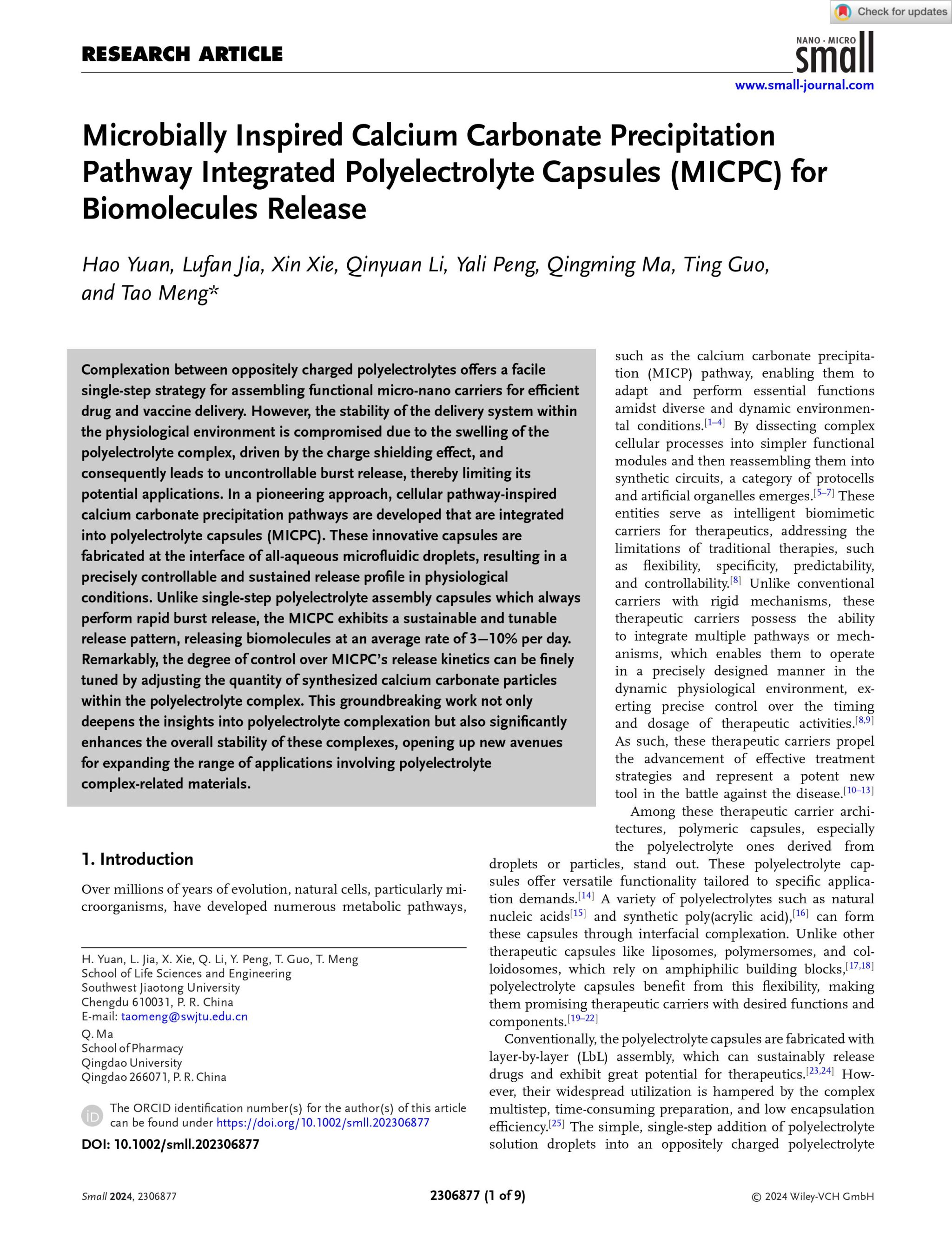 近日,国际微纳生物领域权威期刊《Small》(影响因子13.3)报道了公司“微纳生物技术”创新团队孟涛教授的研究成果“Microbially Inspired Calcium Carbonate Precipitation Pathway Integrated Polyelectrolyte Capsules (MICPC) for Biomolecules Release”中文译名:“受微生物启发的整合碳酸钙颗粒合成通路的聚电解质微囊(MICPC)用于缓释生物分子”(DOI: 10.1002/smll.202306877)。论文第一作者为伟德官网苑昊讲师,通讯作者为孟涛教授,伟德官网为第一署名单位。