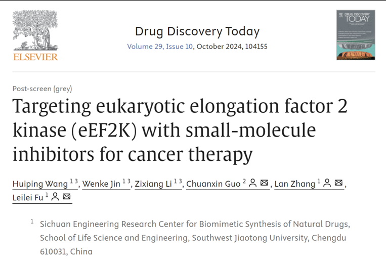 近日,伟德官网符雷蕾团队在美国药学权威期刊Drug Discovery Today上发表了一篇题为“Targeting eukaryotic elongation factor 2 kinase (eEF2K) with small-molecule inhibitors for cancer therapy”综述(https://doi.org/10.1016/j.drudis.2024.104155. 影响因子:6.5)。这篇综述总结了eEF2K 的分子结构及其在癌症中的致癌作用,包括血管生成、肿瘤细胞迁移、增殖、存活和上皮-间质转化(EMT),同时进一步讨论了针对eEF2K的小分子化合物的现状,包括单靶点、双靶点小分子化合物以及新出现的联合治疗策略,以期为肿瘤治疗提供新思路。论文第一作者为2023级硕士研究王会苹,最后通讯作者为符雷蕾,伟德官网为第一署名单位和通讯作者单位。