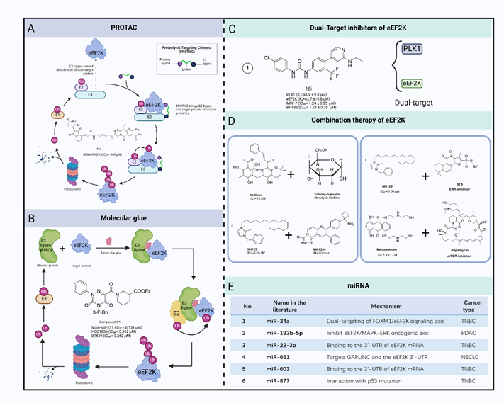 自 1994 年发现首个强效 eEF2K 抑制剂 Rottlerin 以来,在过去二十年中,有关 eEF2K 抑制剂的报道越来越多。目前已发现多种小分子化合物可通过靶向和抑制 eEF2K 的活性来影响癌症的进展。如高选择性单靶点 eEF2K 抑制剂 A-484954、被广泛接受的哺乳动物 eEF2K 抑制剂 NH125、以及双靶点抑制剂 18i。一些新兴的抑制策略,如 PROTAC 策略和联合治疗药物设计,为未来的癌症治疗带来了巨大希望。总之,这些鼓舞人心的发现将为用小分子化合物抑制 eEF2K 的有前景的策略提供新的见解,以大大改善未来的癌症治疗。