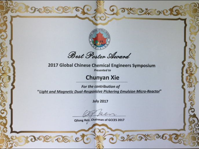 2017年7月18-21日,第九届全球华人化工学者研讨会在美丽的杭州西子湖畔举行。本次会议由浙江大学化学工程与生物工程公司与浙江工业大学化工公司共同承办。全球华人化工学者研讨会的宗旨是汇聚全球化工以及相关领域的专家学者,共同探讨国际化学工程教育与科学研究前沿问题、传播化工知识与技术、推动国际交流与合作、激励学科间的交叉融合和产学研协同创新、促进化学工程与技术领域的学术繁荣、并提高华人化工学者的全球影响力。该国际性学术会议是年度会议,采用国内国外轮流承办的模式。在本次会议中,公司孟涛老师课题组研究生谢春燕同学的学术海报荣获最佳海报奖。