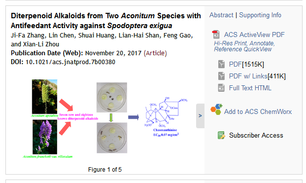 近日,在国家自然科学基金、四川省科技厅、中央高校基本科研业务费专项资金等项目资助下,公司周先礼教授带领的“小分子天然药物”创新团队最新研究成果Diterpenoid Alkaloids from Two Aconitum Species with Antifeedant Activity against Spodoptera exigua在天然药物化学领域顶级期刊《Journal of Natural Products》上在线发表(DOI: 10.1021/acs.jnatprod.7b00380)。博士生张吉发为论文第一作者,高峰教授和周先礼教授为通讯作者。该研究从两种乌头属植物(空茎乌头和展毛大渡乌头)中分离鉴定了7个新的和18个已知的二萜生物碱,发现了新颖的植物源驱虫剂的先导化合物。