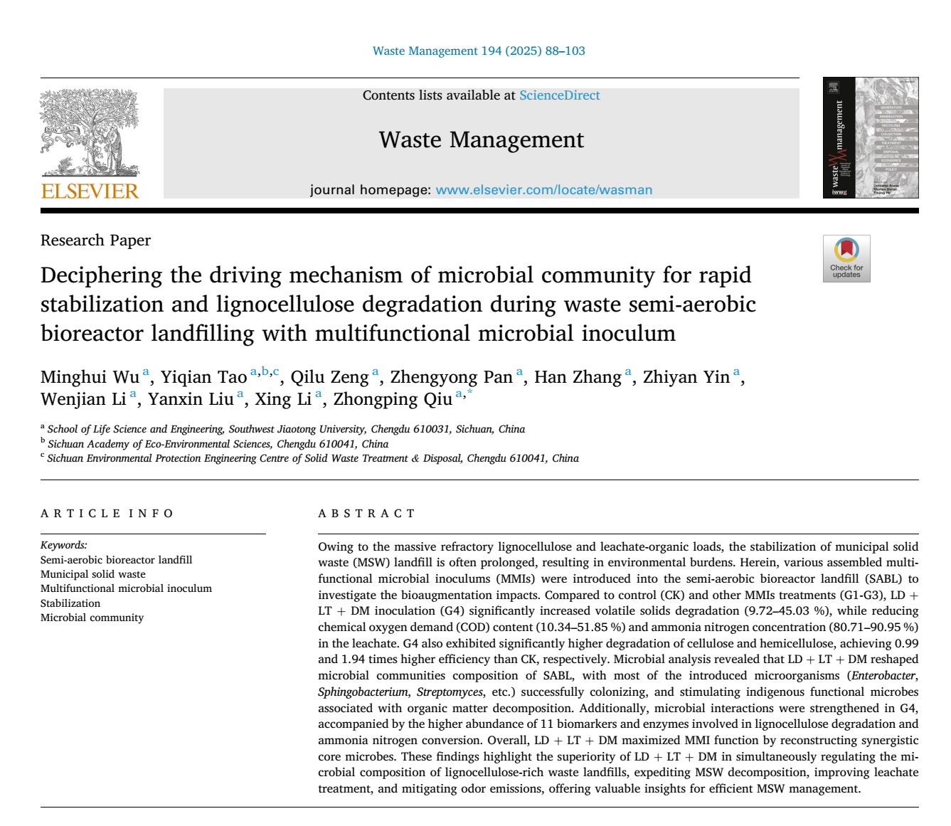 近期,有机固体废物处理与资源化领域顶级期刊《Waste Management》(JCR Q1区,中科院2区TOP期刊,影响因子7.1)正式发表伟德官网“资源微生物技术”邱忠平教授团队的研究成果“Deciphering the driving mechanism of microbial community for rapid stabilization and lignocellulose degradation during waste semi-aerobic bioreactor landfilling with multifunctional microbial inoculum”。论文通讯作者为邱忠平教授,第一作者为吴明蔧老师,伟德官网为第一通讯单位。