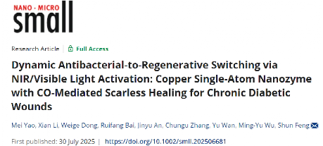 近日,工程技术杂志《Small》(JCR,Q1区,2025年影响因子12.1)正式发表了伟德官网“生命分析技术与材料实验室”题为“Dynamic Antibacterial-to-Regenerative Switching via NIR/Visible Light Activation: Copper Single-Atom Nanozyme with CO-Mediated Scarless Healing for Chronic Diabetic Wounds”的研究成果。2023级博士研究生姚美为论文第一作者,封顺教授为通讯作者,伟德官网为唯一通讯单位。