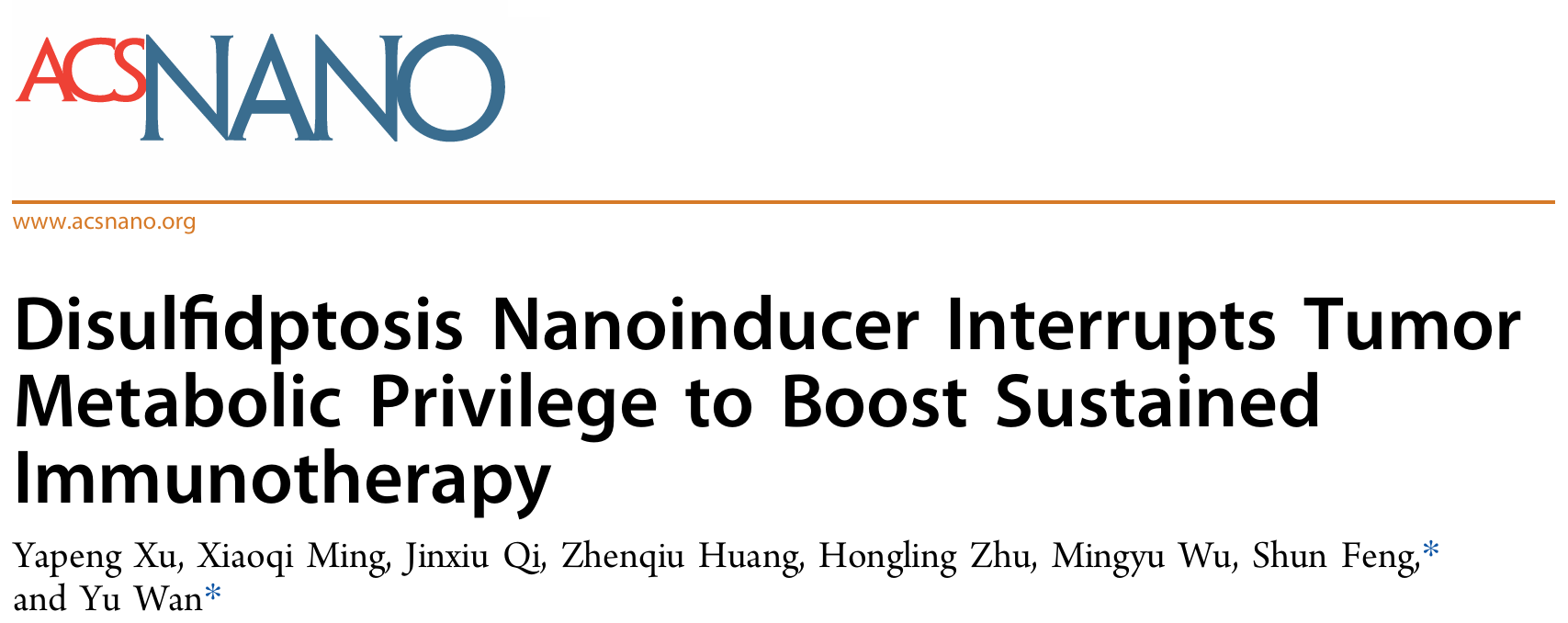 近日,本研究团队在《ACS Nano》(JCR,Q1区,2025年影响因子16)上发表题为“Disulfidptosis Nanoinducer Interrupts Tumor Metabolic Privilege to Boost Sustained Immunotherapy”的研究成果。伟德官网硕士研究生徐亚鹏为第一作者,万瑜副教授和封顺教授为共同通讯作者。