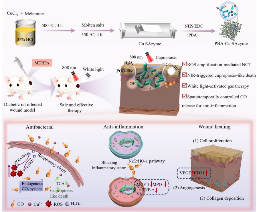 多重耐药(MDR)细菌感染在全球范围内引发了医疗健康危机,尤其是在慢性伤口中,病原体生物膜形成破坏了炎症、感染控制和组织再生之间的微妙平衡。本研究设计了一种苯硼酸功能化的铜单原子纳米酶(PBA-Cu SAzyme),能够动态适应伤口微环境,通过双光激活(近红外/可见光)实现时空可控的“抗菌到再生”切换。体外实验表明,PBA-Cu SAzyme通过多重协同作用有效的清除革兰氏阴性/阳性菌生物膜,且具有促进细胞增殖和血管生成的潜力。体内实验证明了PBA-Cu SAzyme能有效清除细菌感染、多通路促进伤口愈合,且未观察到明显的毒性,最终加速了糖尿病慢性伤口的无疤痕愈合。本研究将自适应纳米酶催化与气体疗法无缝结合,动态协调感染根除与微环境驱动的组织再生,为管理慢性伤口提供了研究思路。
