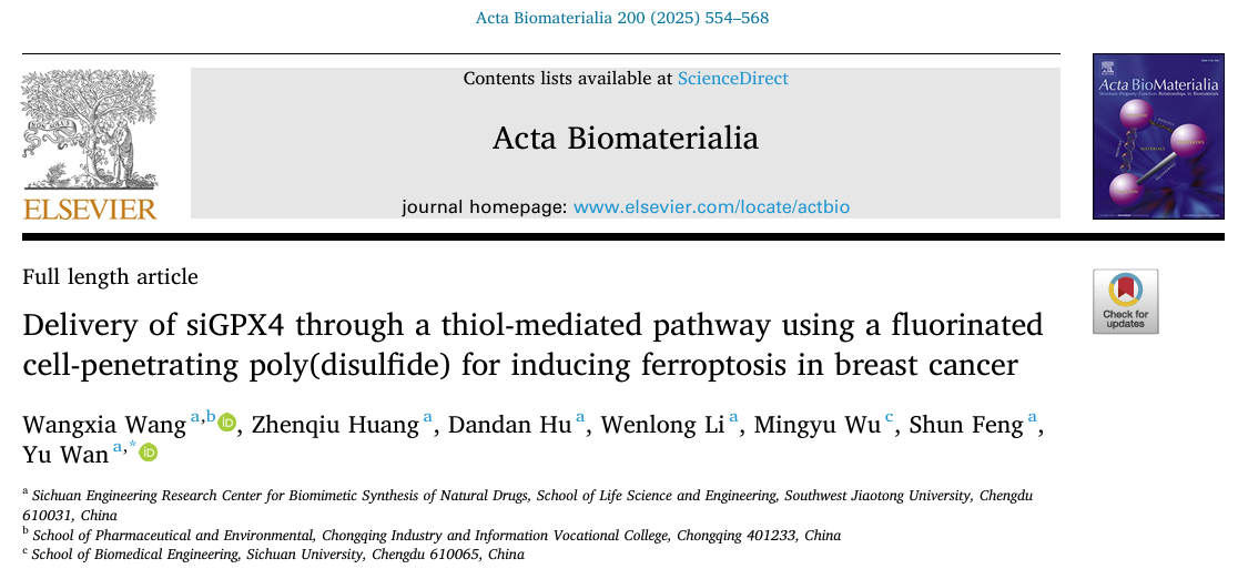近日,本研究成果以“Delivery of siGPX4 through a thiol-mediated pathway using a fluorinated cell-penetrating poly(disulfide) for inducing ferroptosis in breast cancer”为标题发表在《Acta Biomaterialia》(JCR,Q1区,2025年影响因子9.6)上。伟德官网硕士研究生王旺霞为本文第一作者,万瑜副教授为本文通讯作者。