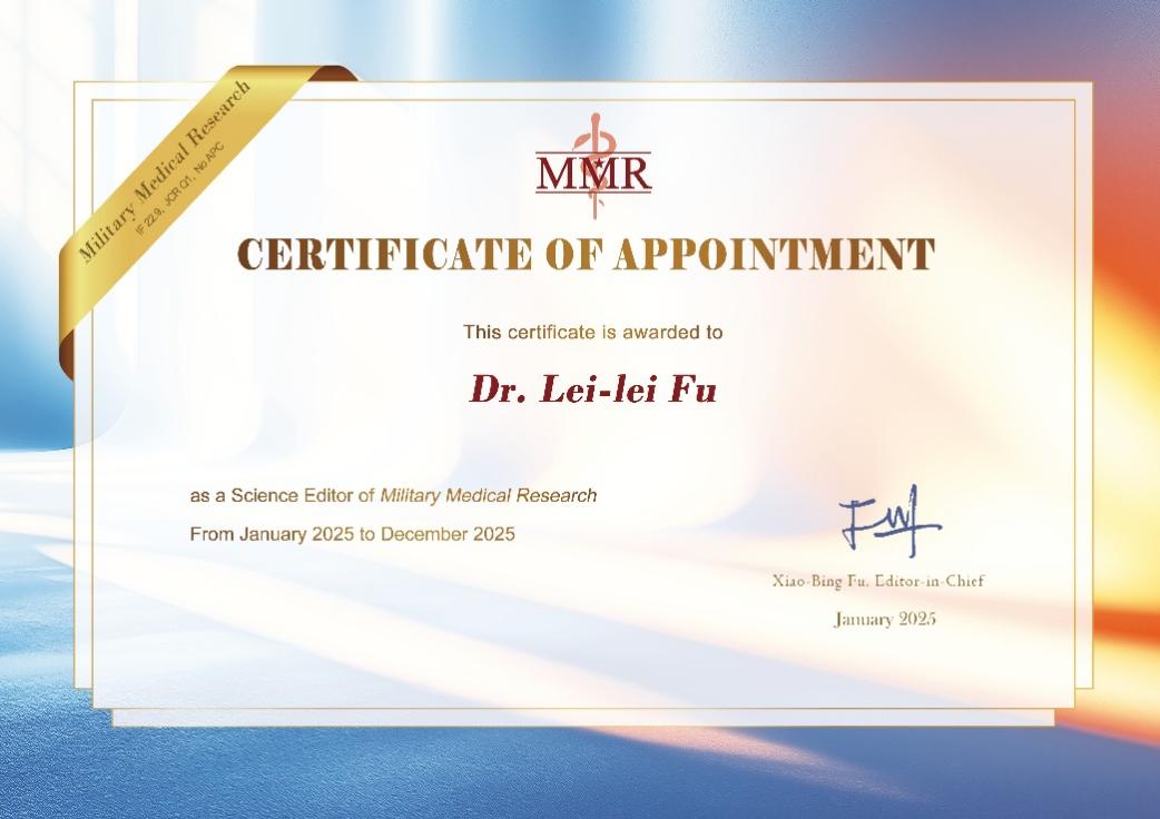 近日,伟德官网符雷蕾副教授受Military Medical Research总编辑付小兵院士邀请,被任命为Military Medical Research(MMR)科学编辑。