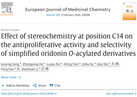 近日,国际药物化学领域权威期刊《European Journal of Medicinal Chemistry》(中科院一区期刊)在线发表了伟德官网天然产物成药性研究团队完成的最新研究成果,论文题为“Effect of stereochemistry at position C14 on the antiproliferative activity and selectivity of simplified oridonin O‑acylated derivatives”。2022级硕士研究生宋俊英为第一作者,谭娇、高峰教授和李晓欢副教授为共同通讯作者,伟德官网为第一通讯单位。