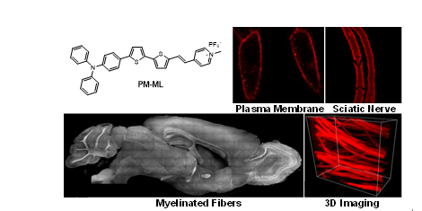 髓鞘是包围和隔离神经轴突的结构,是中枢神经系统的重要组成部分。对脑组织中髓鞘纤维进行可视化研究在很大程度上有助于髓鞘相关疾病的诊断和大脑功能的理解。而目前应用最广泛的髓鞘可视化荧光探针,如Vybrant DiD和FluoroMyelin,其背景荧光干扰大、对比度低和组织渗透性差,这些缺点极大地限制了其在三维成像和髓鞘示踪中的应用。在上述研究的基础上,该项目组基于髓鞘多层质膜的结构特性,通过两亲性的策略成功开发了一种具有AIE性质的近红外荧光探针PM-ML,探针分子在与髓鞘多层质膜结合后能够实现荧光信号点亮并放大的特性显著提高其信噪比,用于高性能髓鞘成像。PM-ML具有髓鞘质膜靶向特性,同时具有良好的光稳定性,能特异性标记出游离坐骨神经和小鼠脑组织中的有髓纤维,可用于髓鞘、髓鞘纤维和束状细胞的三维可视化,具有较高的穿透深度。PM-ML染色与几种组织清理方法兼容,同时在神经病理学研究中评估髓鞘形成的应用也在多发性硬化症小鼠模型中得到证实。该项目成功构建了高空间分辨率的有髓纤维三维荧光成像探针,极大地促进了对三维神经网络和脱髓鞘疾病病理生理学的理解,对髓鞘相关疾病的研究作出巨大的贡献。该成果以“A near-infrared AIE flfluorescent probe for myelin imaging: From sciatic nerve to the optically cleared brain tissue in 3D”为题发表于综合类国际顶级期刊PNAS上《Proc. Natl. Acad. Sci. USA, 2021, 118, e2106143118》IF11.205。全文链接:https://www.pnas.org/doi/10.1073/pnas.2106143118