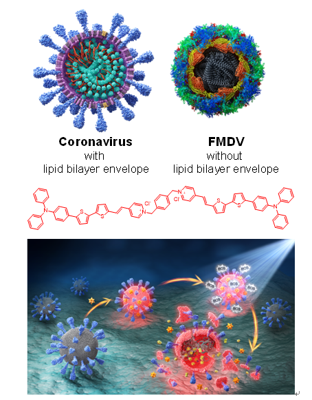 人类冠状病毒(包括COVID-19)是一种包膜病毒,其衣壳和遗传物质覆盖着脂质双分子层,可对宿主细胞外的病毒提供额外保护。由于病毒表面蛋白在不同的人类冠状病毒种类和突变体之间存在差异,而病毒的共有成分双分子脂膜可能是人类冠状病毒通用的靶点。基于此,在熟练应用PM靶向策略以及荧光探针设计理论和实践经验的基础上,项目组成功设计并合成了一种膜靶向AIE近红外光敏剂DTTPB,其可以特异性地靶向人类冠状病毒的脂质双分子层,实现靶向光动力灭活。DTTPB具有覆盖整个可见光范围的宽吸收带和较高的摩尔吸收系数以及高的ROS产率,可用于病毒的高效灭活,有效抑制冠状病毒在环境中的生存和传播。为冠状病毒的灭活和新冠疫情的防控提供了一条有效且独特的预防策略。该成果以“A Membrane-Targeting Photosensitizer with Aggregation Induced Emission Characteristics for Highly Efficient Photodynamic Combat of Human Coronaviruses”为题发表于国际期刊《Small, 2021, 17, 2101770》IF 13.281。全文链接:https://onlinelibrary.wiley.com/doi/10.1002/smll.202101770