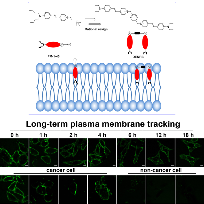 细胞质膜(PM)是细胞内外环境之间的物理屏障,维持着各种生物细胞的完整性。同时PM在细胞生物学中发挥着关键作用,包括细胞的迁移和扩散、膜运输和信号转导等。此外,PM的异常是某些疾病(如癌症)的潜在生物标记物。因此,监测PM的时空变化对膜功能的研究和膜相关疾病的诊断具有重要意义。然而,目前的PM荧光探针存在选择性差、信噪比低、和滞留时间短等缺陷,导致其应用严重受限。公司“生命分析技术与材料”团队吴明雨博士就以上问题展开了系统的研究,在PM靶向荧光成像和光学诊疗方面取得系列研究成果。