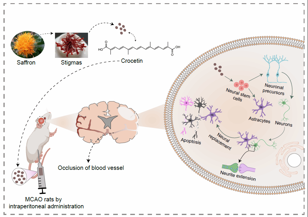近期,伟德官网谭睿教授课题组与中国科公司苏州纳米所程国胜研究员团队组合作,对藏药研究取得的重要突破以封面论文形式发表于国际著名生物医学期刊Advanced Healthcare Materials(TOP1,IF:11.092)上(题为:Crocetin Regulates Functions of Neural Stem Cells to Generate New Neurons for Cerebral Ischemia Recovery)。他们发现藏花酸可通过调控内源性神经干细胞分化产生新的神经元(神经细胞),改善缺血性脑卒中引起神经元大量死亡的现象,从而修复脑缺血性大鼠神经功能性损伤。近年来,脑卒中再生医学研究主要集中在干细胞进行的细胞移植修复。虽有一些令人激动的研究结果,但干细胞替代治疗仍然面临一些障碍,包括免疫排斥、伦理学争论等。该课题组基于临床药效的藏药经典名方中获取诱导体内神经元细胞再生藏药有效成分的报道,是神经细胞再生与神经功能修复领域的一个重要突破,也是传统中药(藏药)治疗脑卒中认识的一个重要突破。
