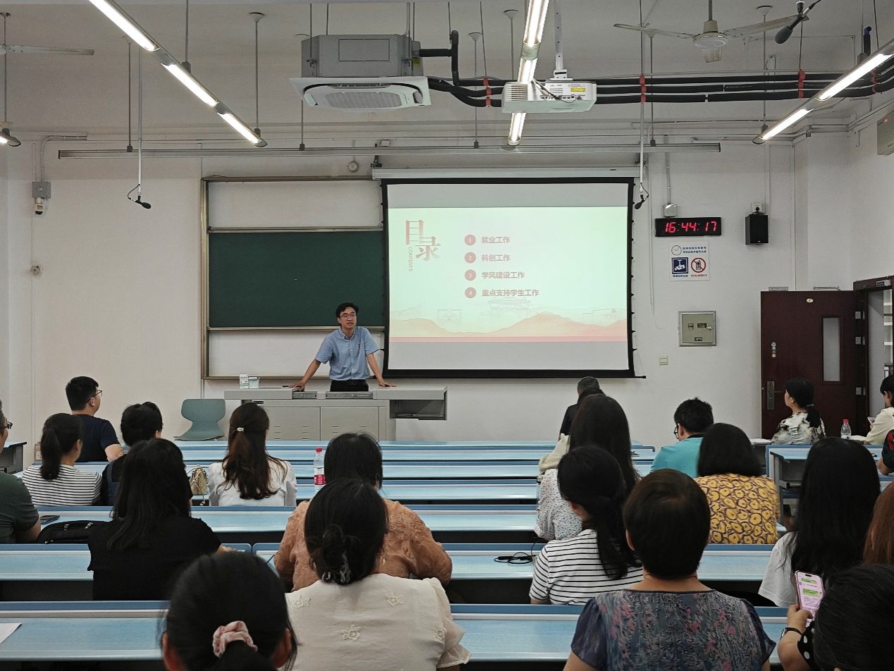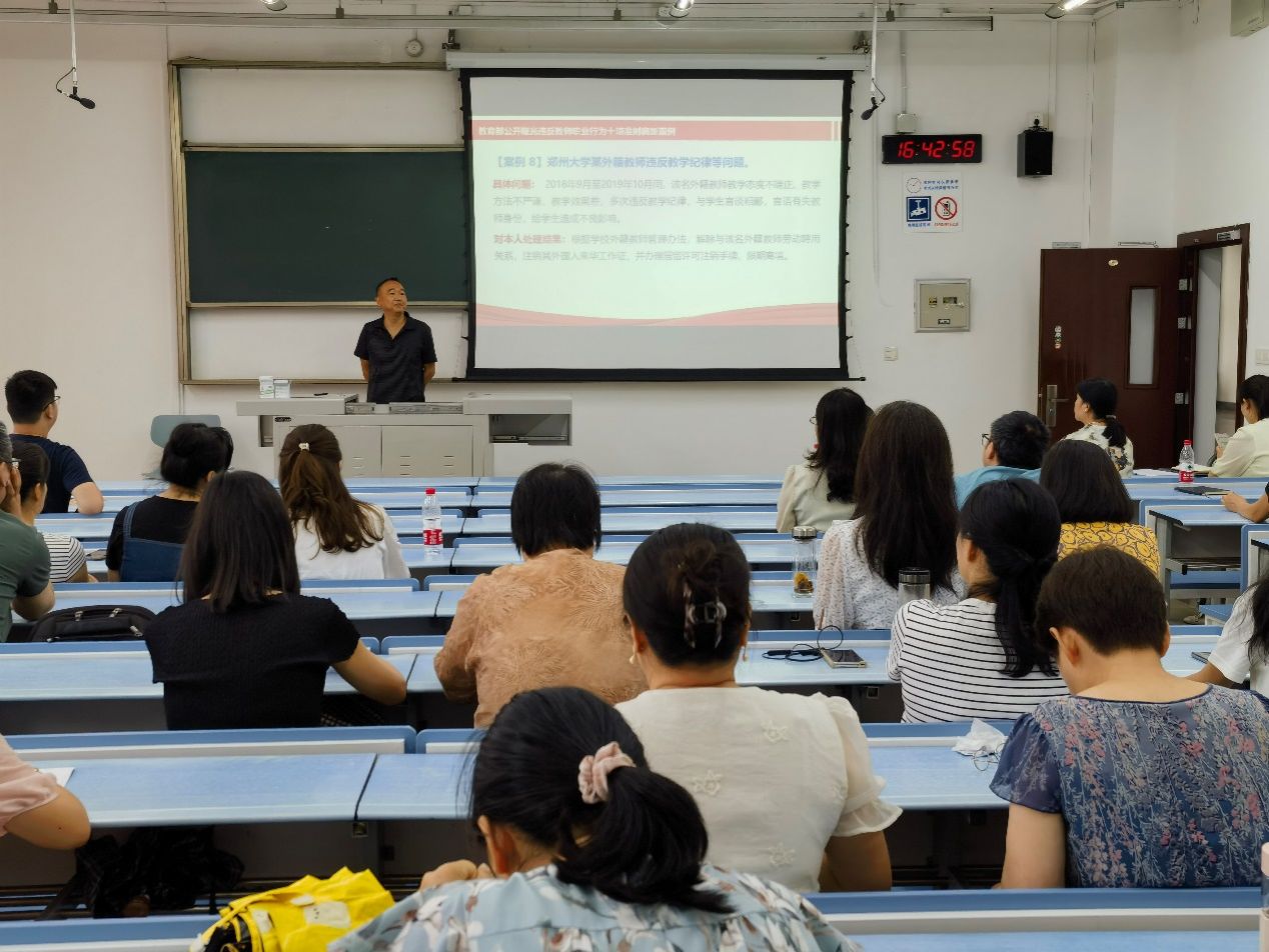 周先礼经理面向全体教职工开展了《新时代高校教师职业行为十项准则》宣讲。周先礼经理选取了八个典型案例,围绕学术不端、材料造假、行贿受贿、违规使用经费或获取经补贴、师生关系及外籍教师违纪问题进行师德失范警示教育,并要求老师们要在日常工作中时刻牢记教师职责,落实立德树人根本任务,弘扬新时代高校教师道德风尚。