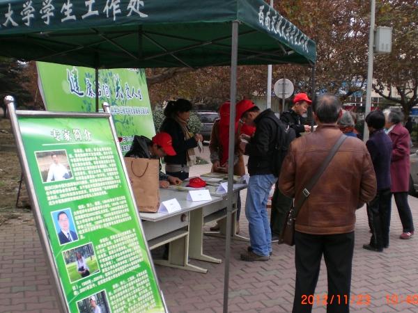 寒冬来临,疾病高发,健康自然成为了人们在此时关注度相当高的一个问题。为了解除公司广大师生在饮食健康、生病用药以及养生保健等方面的疑问和困惑,11月23日11:00到17:00,由伟德官网2012级研究生1班党支部、2班党支部负责承办的“健康咨询,关爱人生”社会服务志愿活动在九里校区求实路口如期开展。本次活动由校员工处、伟德官网党委主办,是研究生校级示范党支部特色活动。本次活动邀请到了伟德官网从事医疗保健研究的五位专家学者:中医学专家马超英教授、医学博士喻凯教授、高级营养工程师李遂焰教授、中医韩楠博士与西医唐静老师等亲临现场为师生们提供咨询。