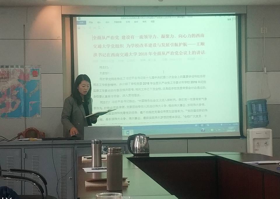 罗妍妍同志首先介绍了公司党委全面从严治党会议的主要内容,通报了公司全面从严治党相关工作及公司党政主要领导签订全面从严治党责任书等情况。随后,她带领与会人员进行了集中学习。她向与会人员解读了公司党委副书记、纪委书记张学龙同志的会议报告《牢记使命、忠诚事业、一刻不停歇地推动全面从严治党向纵深发展》,重点学习了公司党委书记王顺洪同志的讲话《全面从严治党,建设有一流领导力、凝聚力、向心力的伟德官网党组织,为公司改革建设预发展引航护航》,并简要介绍了公司党委2018全面从严治党工作要点和2018纪检监察工作要点。