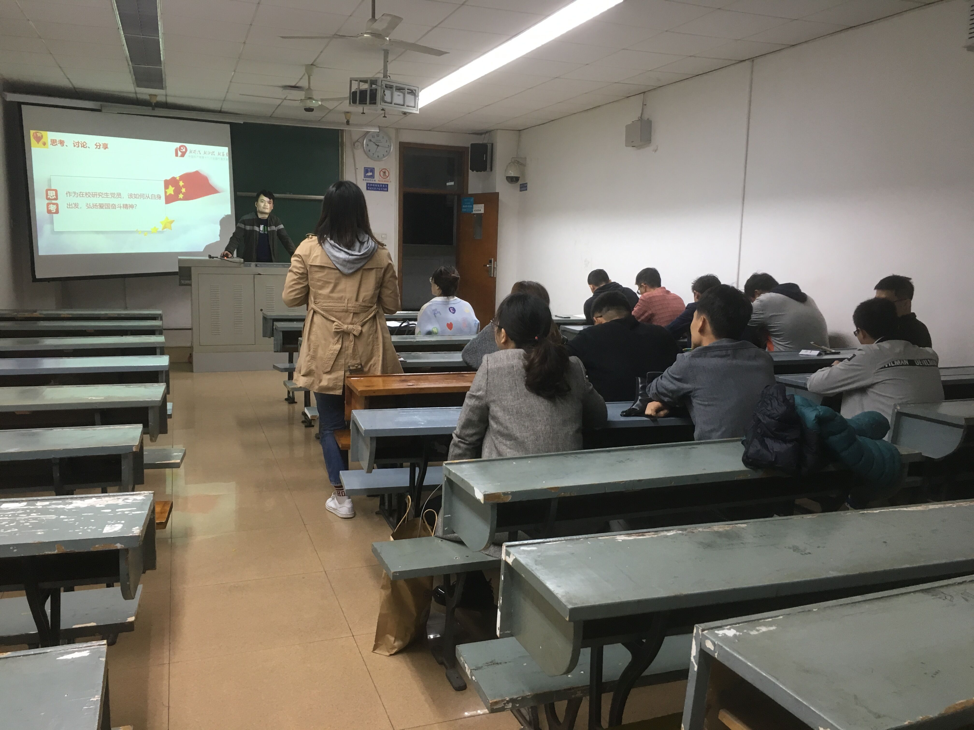 2016级硕士党支部于10月18日晚在4305A教室召开“弘爱国奋斗精神,扬硕士党员风采”主题党日活动。活动由支部书记韦乐华主持,支部全体党员参加了学习,支部指导教师、公司专职组织员华晶晶也出席了本次活动。