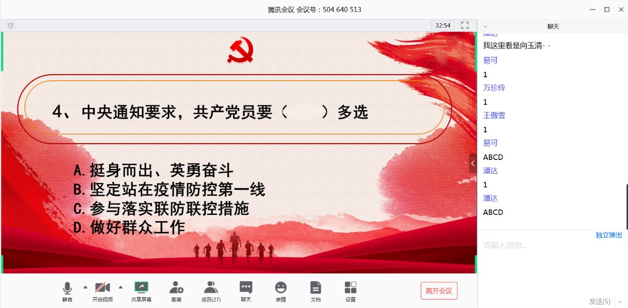 2020年4月9日,伟德官网本科制药工程党支部通过腾讯会议开展了“疫”情里的春天——抗“疫”知识大赛暨图文故事征集线上活动,学习习近平总书记关于新冠肺炎疫情防控工作的重要指示批示和讲话精神并交流学习心得,学习抗击新冠肺炎疫情一线先进人物事迹,进行抗疫知识竞赛,并以“疫情里的春天”为主题进行了图文故事分享。本科制药工程党支部全体正式党员、预备党员参加此次活动,活动由本科制药工程党支部副书记向月和组织委员杨程硕主持。