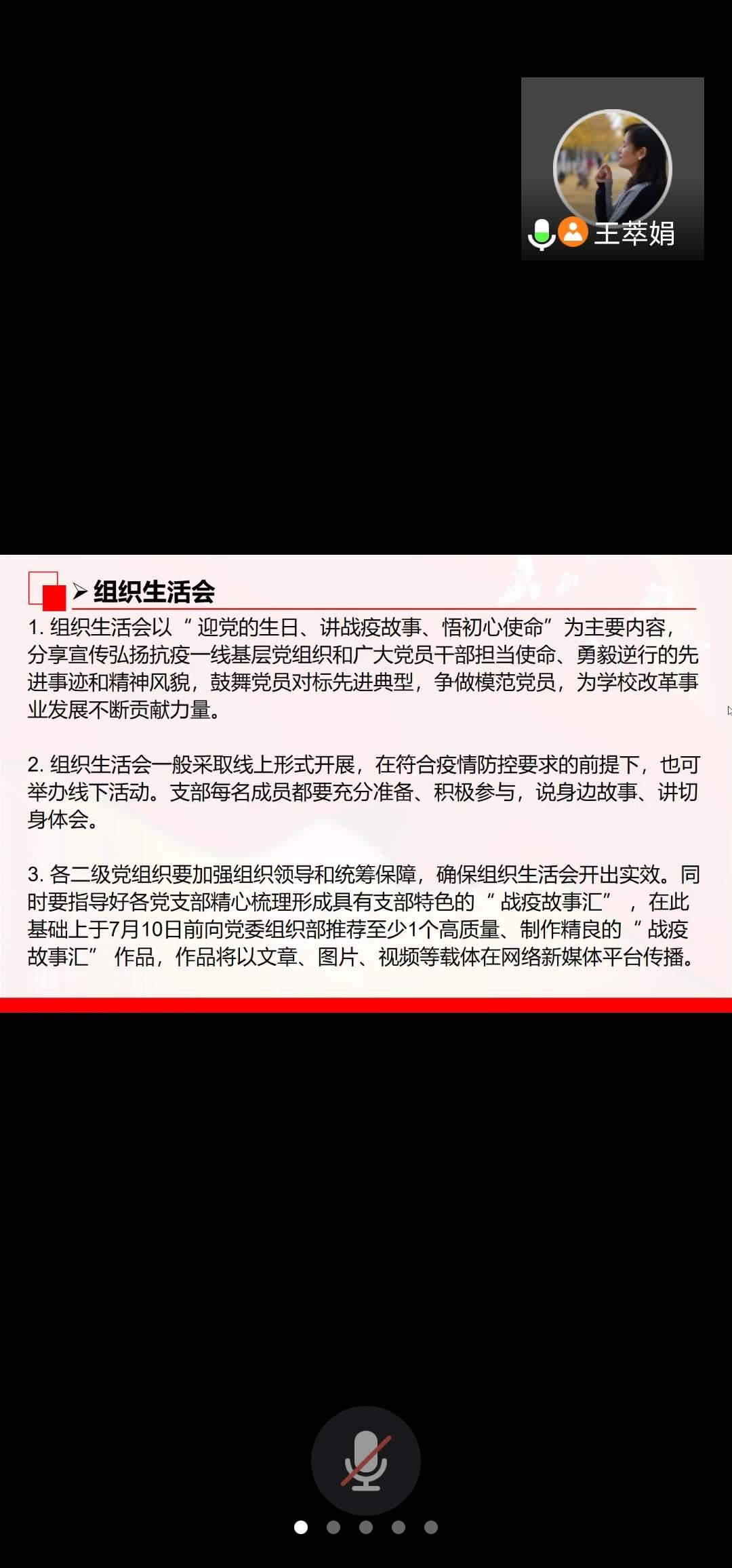 会上支部书记王萃娟同志组织与会的党员同志分享身边的战“疫”故事。系主任陆群同志带头发言,以老党员方伊同志坚定信念学习网络教学为例,分享其中的点点滴滴。方老师眼睛不好,看屏幕看久了就会难受,而且年龄偏大对复杂的电脑操作也不熟悉。就是这种情况下方老师仍旧坚持学习,在两周内圆满完成备课并顺利开展本科教学工作。另外,在疫情期间组织教改项目申报时,熊维巧同志、方伊同志和王萃娟同志等一批老党员发挥了带头模范作用,高质量的完成了教改的申报工作。