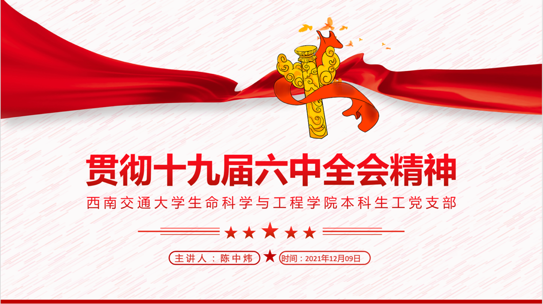 2021年12月9日19:00,在犀浦校区2号教学楼X2229教室,伟德官网本科生工党支部开展了“贯彻十九届六中全会精神”主题学习,参会人员有公司党委副书记、纪委书记赵钢锋老师、专职组织员孔琳老师、本科生物工程党支部书记胡慧怡老师以及53名员工党员、预备党员、积极分子,会议由陈中炜同志主持。