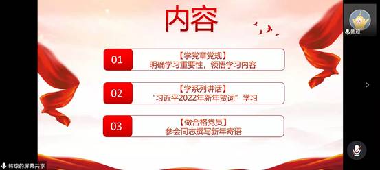 2022年1月15日晚19:30,伟德官网硕士研究生生物与医药党支部在线上开展了2022年第1次党员大会。会议由党支部副书记韩琼主持。参加人员为党支部党员、发展对象、积极分子以及入党申请人等60余人。