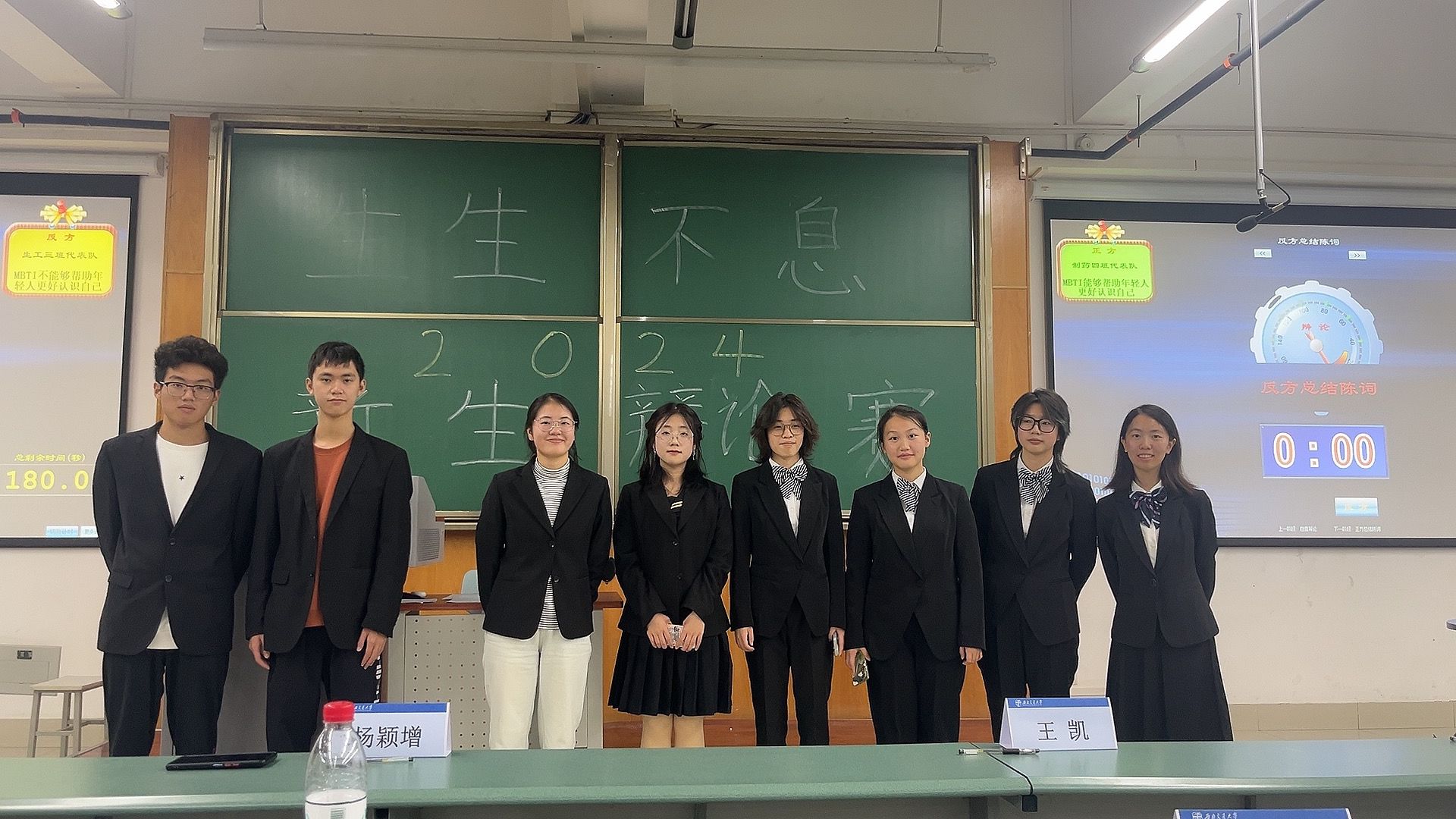 正方是制药工程2024-04班的四名选手:他们的观点是MBTI能够帮助年轻人更好认识自己,反方是生物工程2024-03班的四位选手:他们的观点是MBTI不能够帮助年轻人更好认识自己。