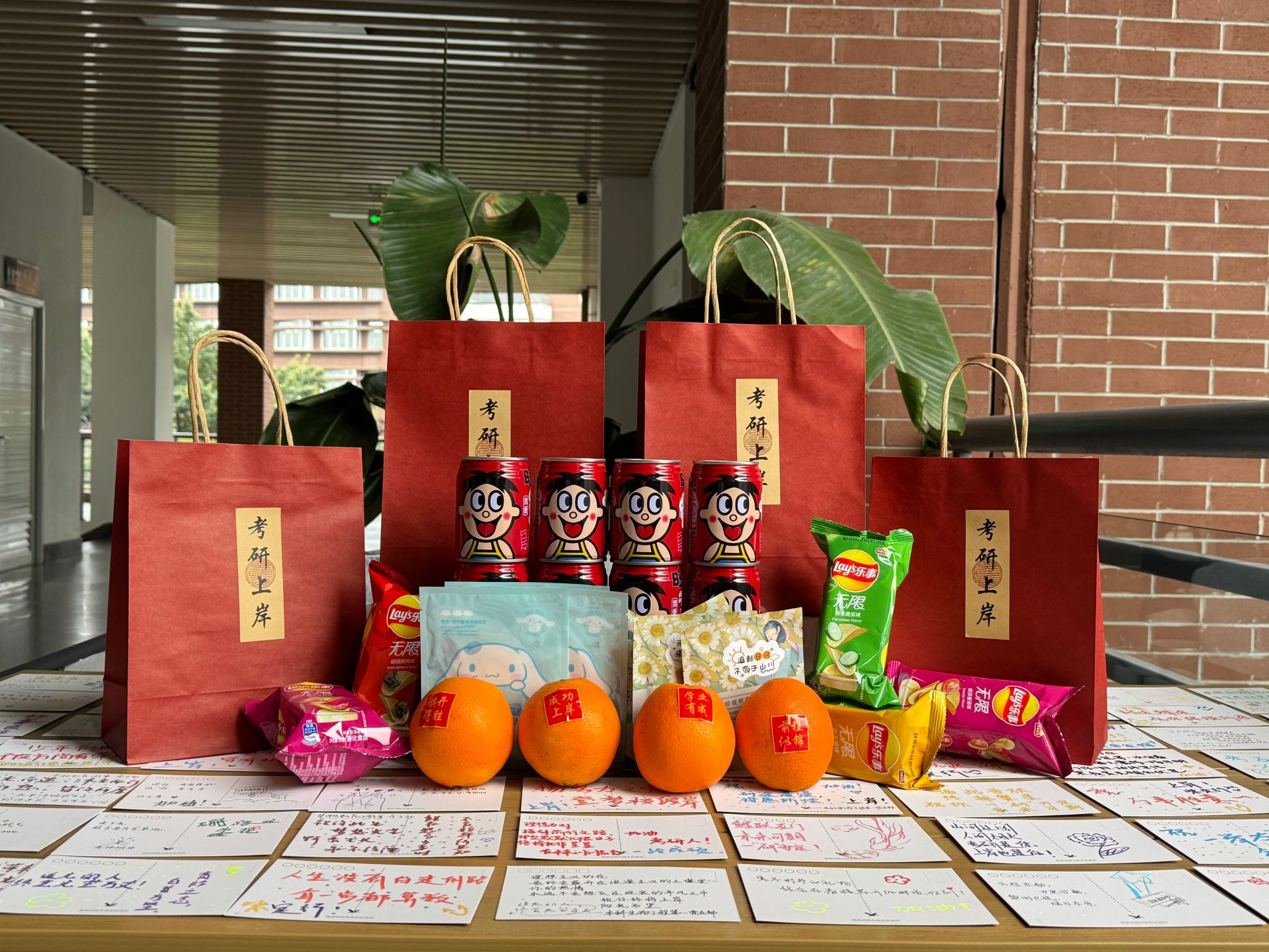 公司为考研学子精心准备的“考研上岸”暖心礼袋,礼袋里每一份礼物都寄托着公司对考研学子们的亲切关怀:公司师生亲手书写的明信片传达着对考研学子的殷殷祝福;橙子代表心想事成,一战“橙”硕;“乐事”薯条祝福学子们定能乐事发生;旺仔牛奶为考研学子们传递好运旺旺;暖身贴为在冬日里辛苦备战的学子们加油助力,鼓励着每位学子以昂扬的斗志和积极的心态投入到备考中。