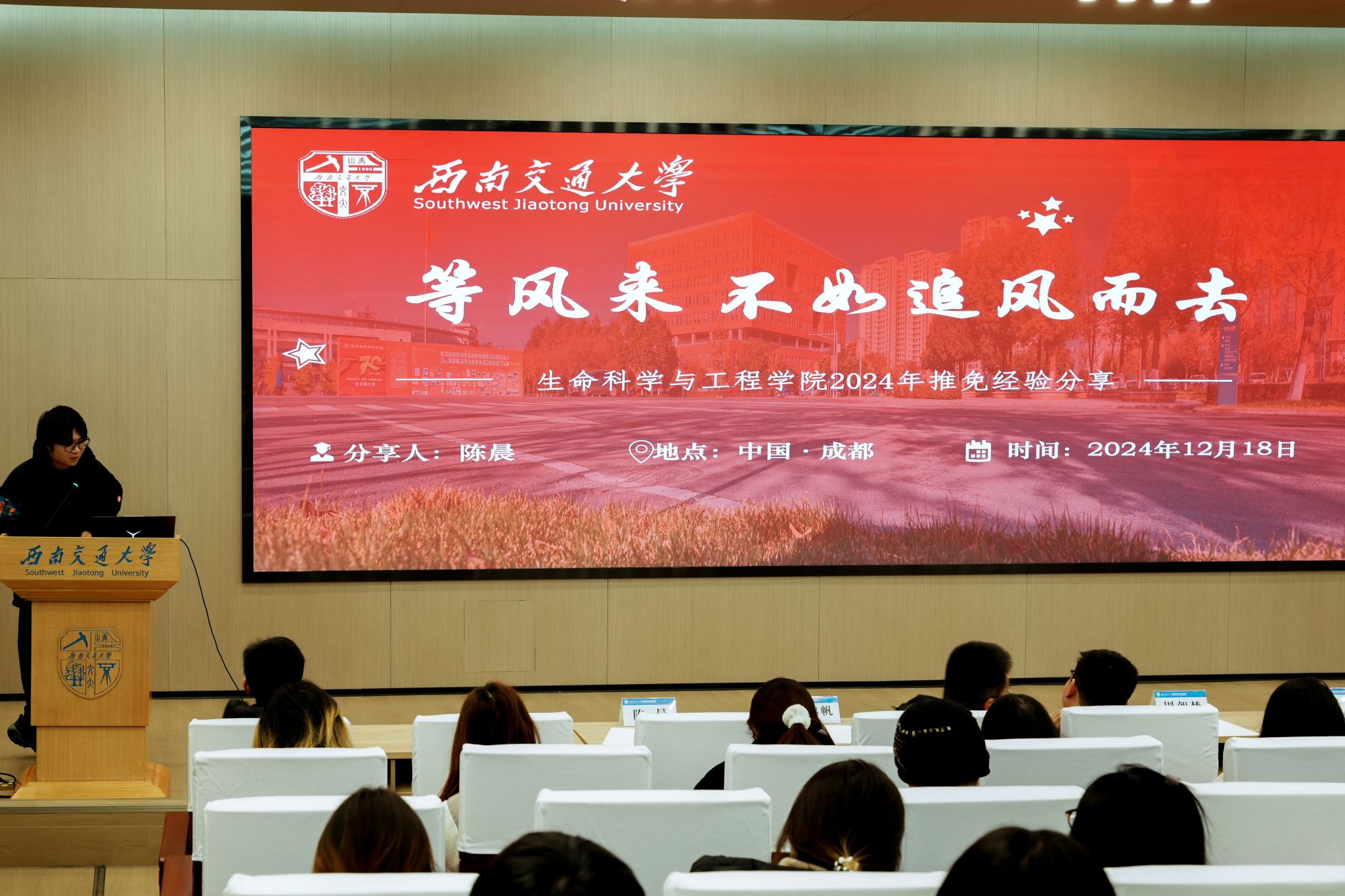 随后,2024年竢实扬华奖章获得者、公司青年讲师团成员陈晨同学分享了宝贵的推免经验。陈晨同学认为推免成功的关键在于明确目标、合理规划学术路径,并提前准备推免材料,突出个人优势。材料的精细打磨和导师的有效沟通是争取机会的核心环节。