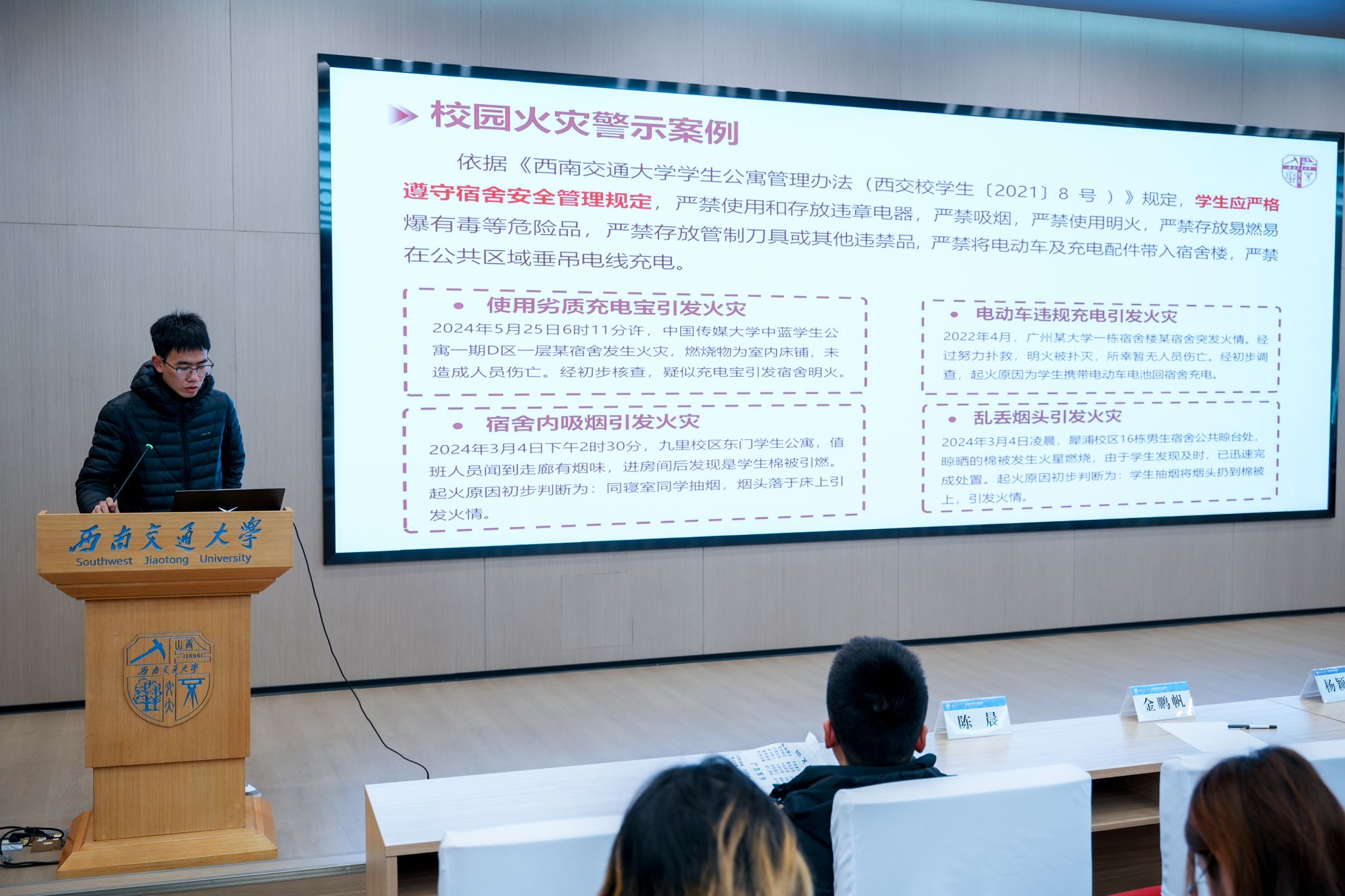最后,2022级辅导员潘星宇老师围绕安全问题与期末考试作了重要提醒。他重点强调冬季防火、防盗、防诈骗及意外事故的防范,并提醒同学们要提高安全意识、筑牢安全防线。同时,他还就期末考试的学术诚信和考场纪律提出严格要求,号召大家恪守基本准则,杜绝作弊行为。