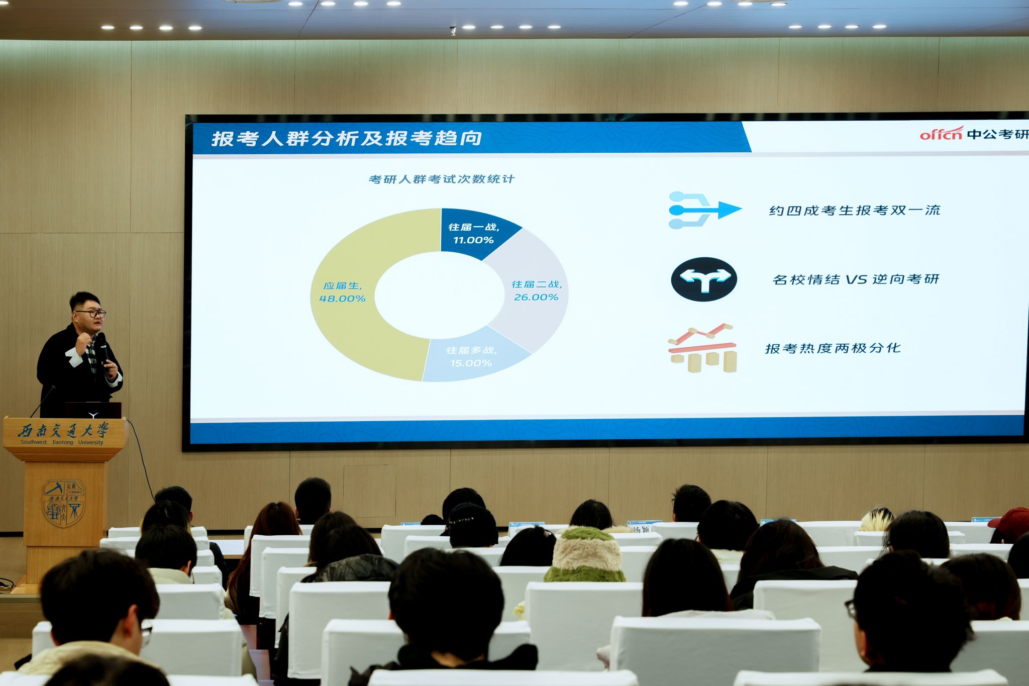 大会伊始,伟德官网校外生涯导师、中公考研教研室主任梁萧老师作了关于考研与考公的主题分享。梁萧老师强调选择比努力更重要,同学们应根据兴趣和职业规划做出理性选择。他还建议同学们结合自身兴趣与未来发展趋势,制定切实可行的备考计划,保持积极心态,为实现目标做好充分准备。