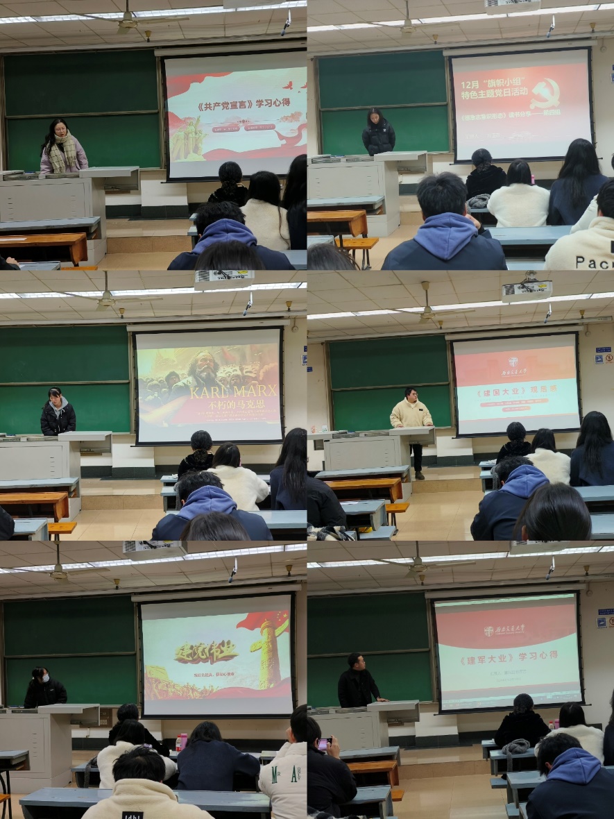 为筹备此次活动,党支部委员会于2024年11月牵头组建了9个马克思主义理论学习小组,每组由1名23级或24级党员带领若干入党积极分子、入党申请人共同参与。支委精心挑选了《共产党宣言》《资本论》等经典著作及《青年马克思》《建党伟业》等红色影视作品作为学习材料,各小组通过自主学习、撰写心得、集中研讨等形式,为成果展示打下扎实基础。