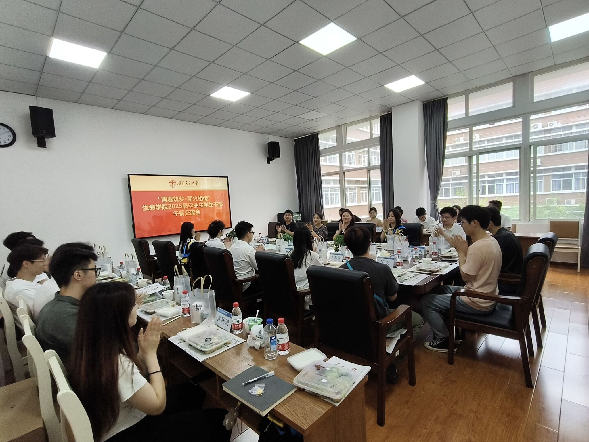 在轻松愉悦的午餐氛围中,师生围坐畅谈,餐盘里盛满的不仅是美味午餐,更是公司对2025届毕业生们的殷切祝福。毕业生员工干部们敞开心扉,将这场聚会变成了一场别开生面的"青春梦想分享会"。大家纷纷分享了自己的职业规划和人生理想,团建中心徐同学结合自身在苏州医疗产业的实习经历,向同学们发出邀请:"苏州生物医药产业园已形成完整产业链,期待与更多员工在长三角地区共同发展。"即将赴四川大学深造的杨同学则表达了对科研的热忱:"合成生物学领域充满无限可能,希望能与志同道合的伙伴一起探索生命科学的奥秘。"青年志愿者协会陈同学从行业视角分享了对生物医药领域发展的见解;员工事务中心方同学结合就业经历,鼓励同学们:"生物医药是国家重点发展领域,坚持专业深耕必将收获成长。"员工融媒体中心李同学、员工会董同学等员工骨干也分享了各自的毕业去向,并相约未来在各自城市再聚首。
