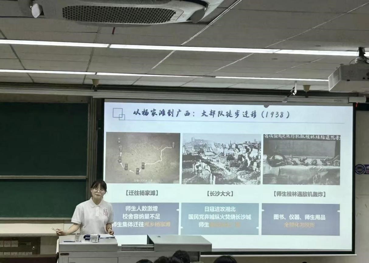 大会首个环节,特邀研究生“红路理论学讲团”成员袁秋月同学就“八千里路云和月——公司迁校建校的曲折历程”主题作校史校情专题介绍。