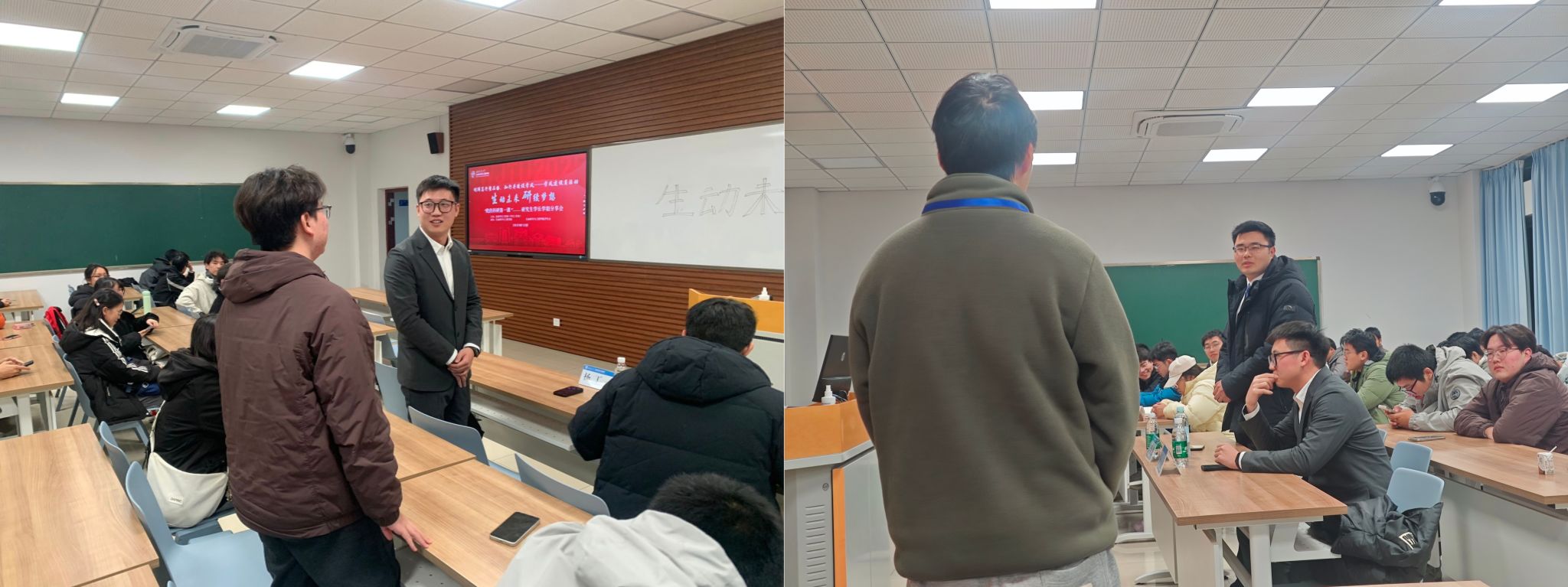 在互动环节,同学们围绕“是否应选择直博”“如何确定研究方向”等学业成长与职业生涯规划问题踊跃提问。嘉宾结合个人成长经历,分享了培养科研志趣与坚持深耕的重要意义,为同学们提供了宝贵的经验参考。