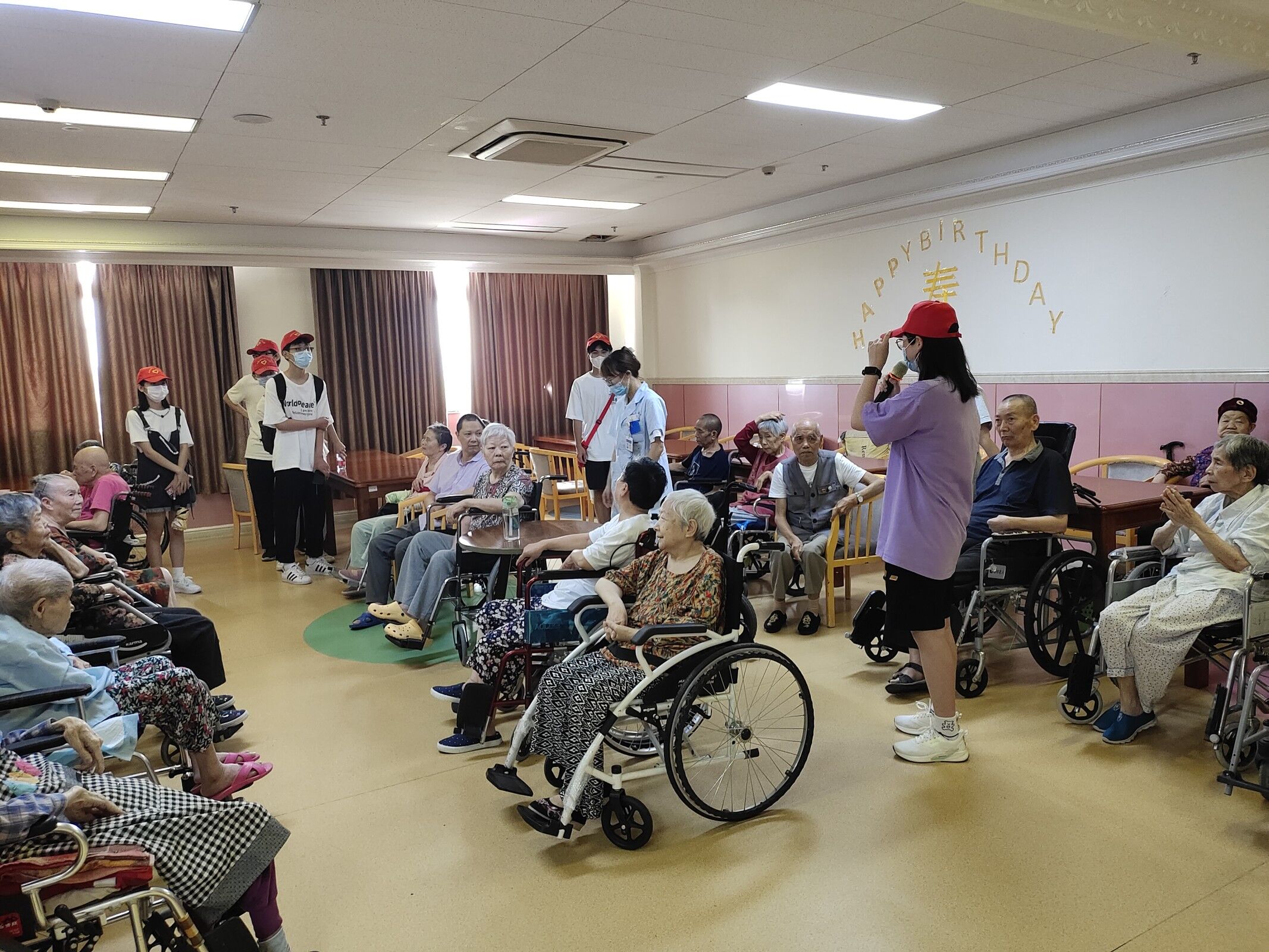 志愿者到达养老院后,经过简单的交接,工作人员将志愿者分配给不同的护工,护工向志愿者介绍了他们的日常工作并给志愿者们安排了简单的清扫工作,让志愿者们拿着毛巾去清理栏杆和板凳上面的灰尘,或是擦拭玻璃。在完成这些任务后,由于新颐园养老院还在扩建装修,在养老院的场地内堆放了许多废弃的垃圾,志愿者们又在工作人员的带领下,去院子里捡拾垃圾,让养老院的环境变得更加整洁和舒适。此次去的三个养老院的面积虽然都算不上很大,但相应的配套设施一应俱全,走过浓密树木下的林荫小道,可以看到不少老人在这乘凉,交谈声中也不时流露出欢声笑语。志愿者们前往老人们的居住区,在工作人员的帮助下,志愿者们成功地在老人们面前表演了简化太极拳,同时也合唱了《我和我的祖国》《茉莉花》等经典歌曲,引起许多老人小声跟唱,表演结束后,养老院里也响起了热烈的掌声。不难看出,志愿者们的演出深受老人们的喜爱,为老人们的生活增添了一份别样的色彩。在文艺表演结束过后,青年志愿者们相继分散开来,就近与身边的老人聊天,老人们敞开心扉讲述自己的故事,志愿者在一旁认真倾听,让老人们感受到温暖的陪伴。志愿者和老人们的相处十分融洽,欢声笑语回荡在整个养老院。时光转瞬即逝,在短短的几天内,青年志愿者们与老人们建立了浓厚的友谊,最后在老人们不舍的目光中,志愿者们结束了行程。