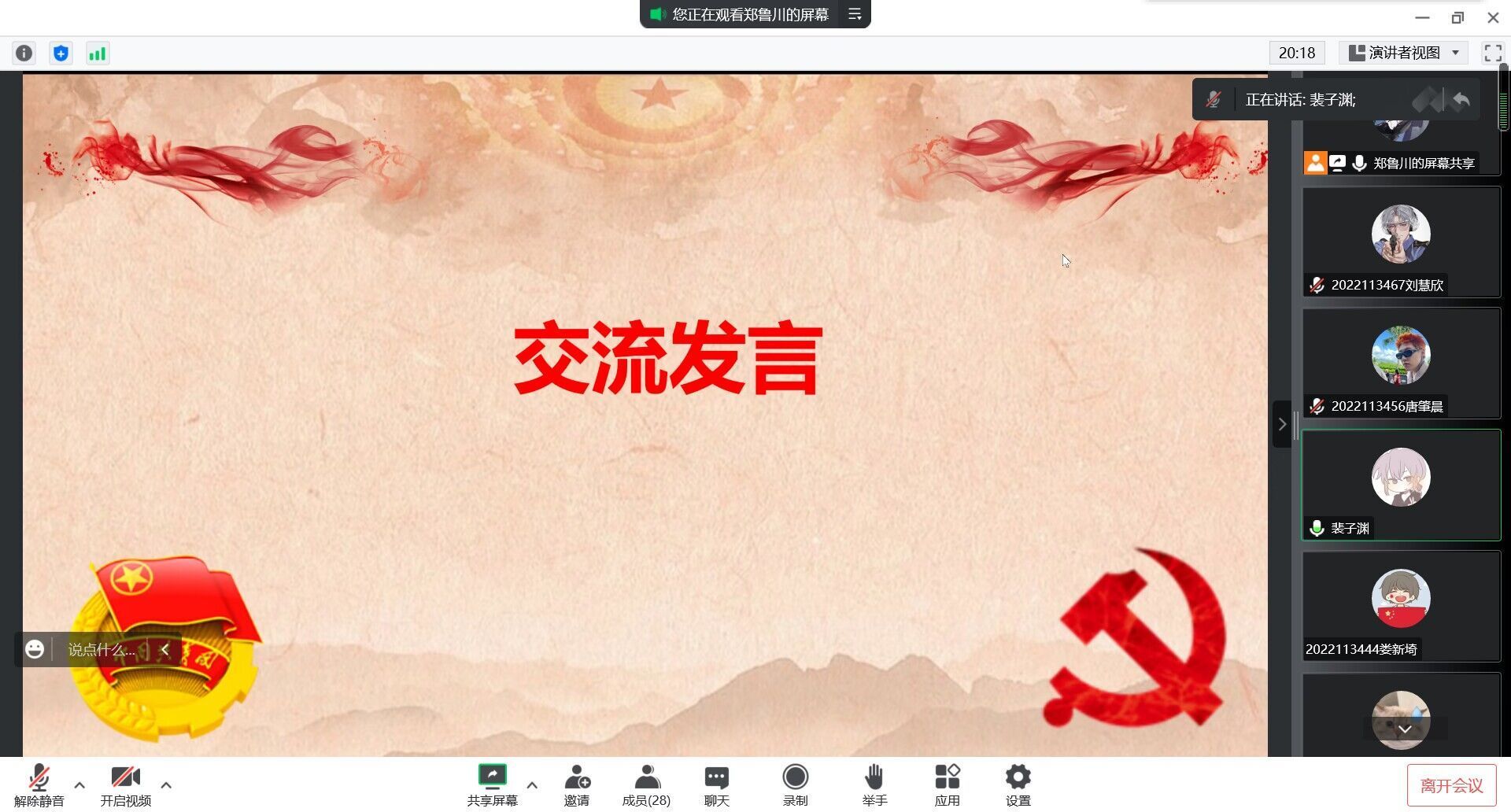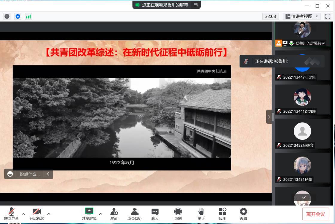 制药工程2022级02班于2022年9月23日在线上进行了开学第一堂团课,由团支书郑鲁川主持此次活动,制药2班全班28人参加本次团课。