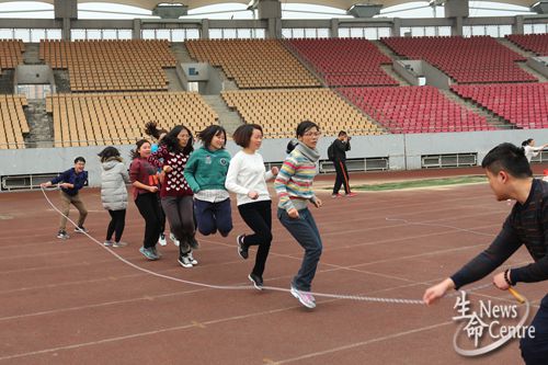 经过运球接力项目的热身,女教职工们逐渐进入了状态。接下来的跳绳运动恰好给教师们展现良好身体素质和默契程度的机会。经过简单的磨合,控绳队员与跳绳队员发挥良好。由于是大型团体体育运动,跳绳比起其他项目要求的队员配合程度更高,伟德官网的老师们不断挑战极限,最终取得一分钟跳绳37次的好成绩。