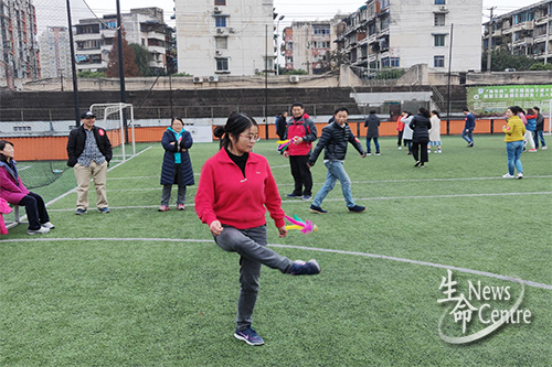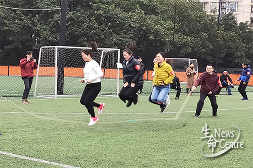 随后主持人代领大家进行活动前的热身,在讲解了游戏规则和活动安全注意事项后,游园活动正式开始。本次活动由乒乓球拍托球接力跑、趣味羽毛球、趣味保龄球、集体跳绳、踢毽子、抛接纸球、交大大富翁等七个小游戏组成。比赛采取随机分组、团队应战、闯关积分的形式进行。