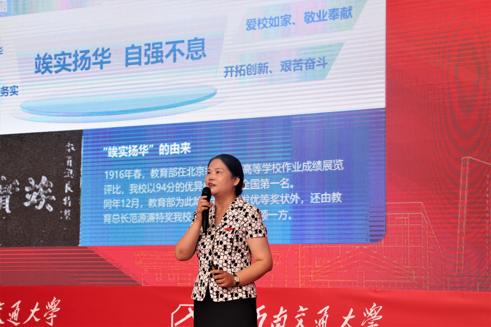 黄春蓉书记宣读公司2024级新生班导师、辅导员、驻班党员名单,勉励同学们爱党爱国、志存高远,努力成长为有格局、有情怀、有视野、有担当的新时代西南交大生命人。