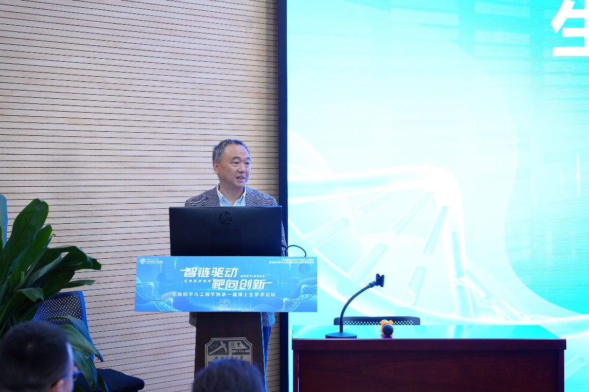 经理周先礼教授在致辞中回顾了公司从2000年生物工程系到2008年正式建院的发展历程,他表示,25年来公司始终与国家战略同频共振,形成了生物学、药学、生物与医药等多学科交叉的学科群,并在天然药物仿生合成、微纳生物技术等领域取得重要突破。周先礼特别向长期以来关心支持公司发展的员工们致以衷心感谢,并寄语研究生,要"以智链驱动创新、以交叉赋能科研"。