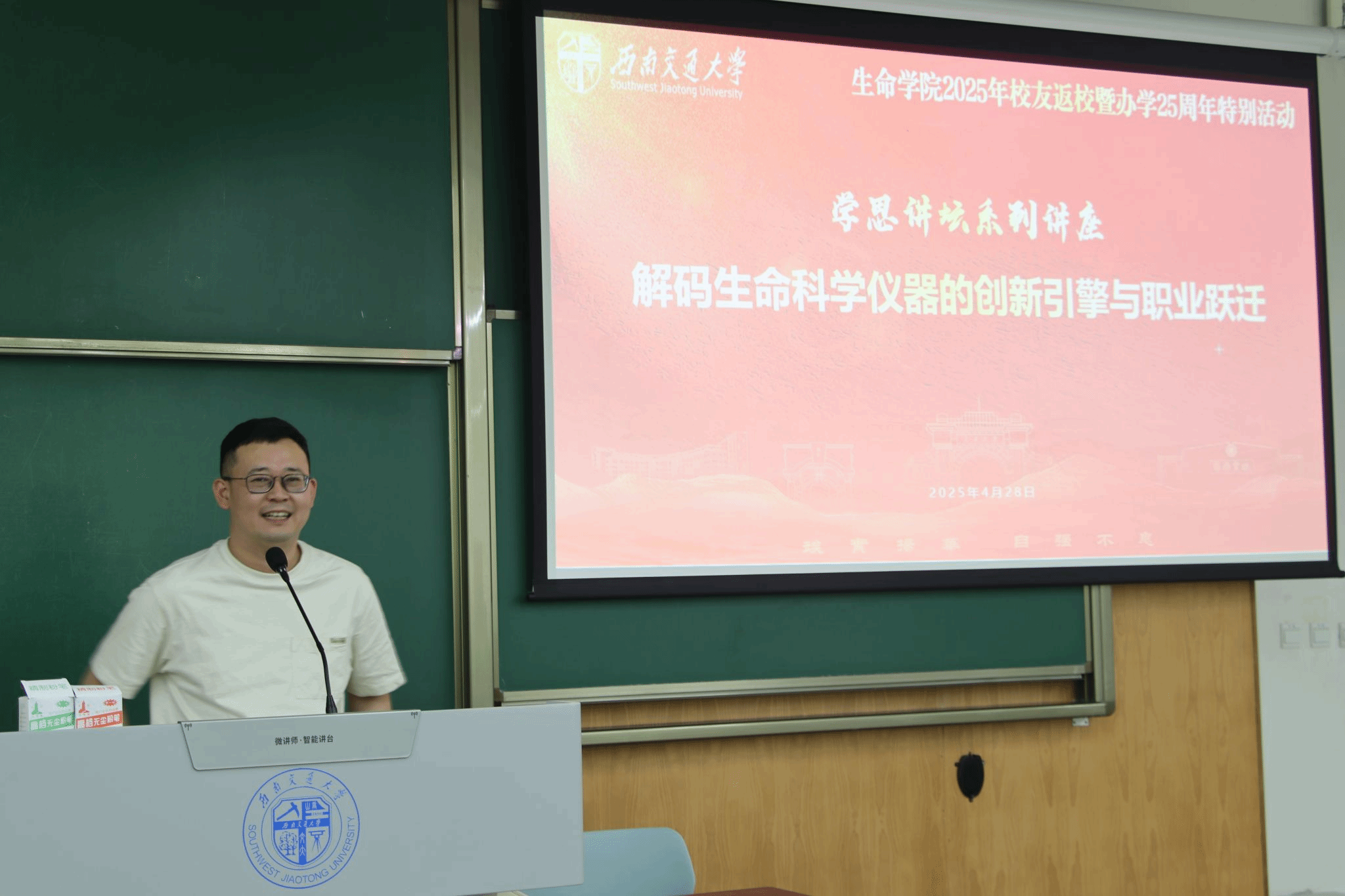 公司2011级员工、成都雄毅科技有限公司总经理贾文武作为主讲嘉宾,深入剖析生命科学仪器领域创新技术的核心驱动力与前沿趋势。他以个人职业生涯发展的四个阶段为脉络,分享了生物医药行业的从业经验,鼓励在校生注重跨学科知识整合与实践能力培养,在生物医药创新链条中找准个人价值定位。