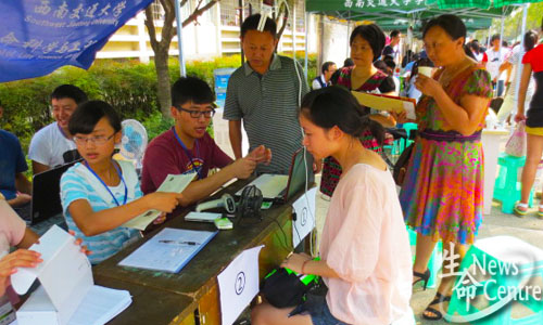 6:30,迎新点的志愿者们迎来了今年第一位新生——制药三班张芬同学,现场气氛迅速活跃起来。按照迎新流程,志愿者热情帮助她查询学籍号、班号、寝室号,并发送一卡通、印有伟德官网标志的环保袋及“蓝色神秘礼包”——其中包含的不仅仅是新生手册、一封来自学长的信,更是浓浓的交大情、生命情!随后指导她填写学籍表、讲解相关学费缓交流程、为其拍照留影,最后,接待小组帮忙提行李直至寝室楼。随后,更多新生陆陆续续来到迎新点,志愿者没有一丝怨言,协同合作将迎新工作进行到底!