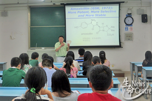 李博士走向讲台,他爽朗的笑声、和蔼的态度就感染了现场的所有人。之后,他熟练地用英语分别向大家介绍了关于抗生素的发明历史、不同的抗生素的合成及药用原理以及跟抗生素相关的小故事等。诙谐而专业的表达及丰富的肢体语言让大家在笑声中获益匪浅。