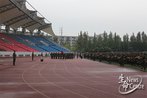 九月的天公不作美,赤日当空,让新生们真正体会到“你若军训,便是晴天”的感受。但当我们的记者到达新生军训指定地点时,看到的却是另一番的景象:同学们正穿着厚厚的军训服装站着军姿,虽然汗流满面,但所有人却都保持着坚挺的身躯,执着地挑战着自我的极限。