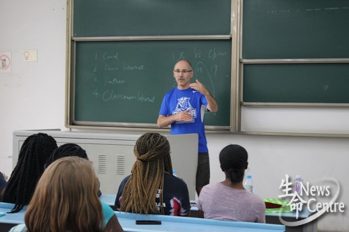 首先,由黄新河老师致开场词,他对GSU访问团的到来表示热烈欢迎,并对出席本次活动的Eric老师及各位同学表示感谢。紧接着各位同学进行自我介绍,来自美国和中美班的同学交替进行。同学们兴致勃勃,分别从英文名、中文名、兴趣爱好、喜欢的食物等进行详细介绍,群情激昂,现场气氛欢快而热烈。