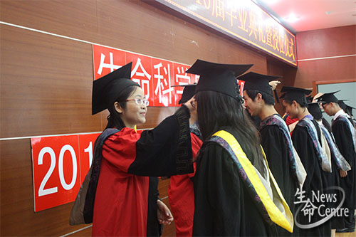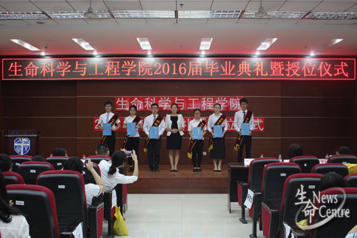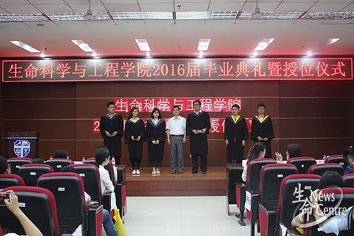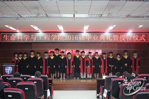 最后,在“翳唐山,灵秀钟;我公司,声誉隆…”的校歌声中,由教授委员会委员、学位分委会委员为全体本科毕业生授学士礼。