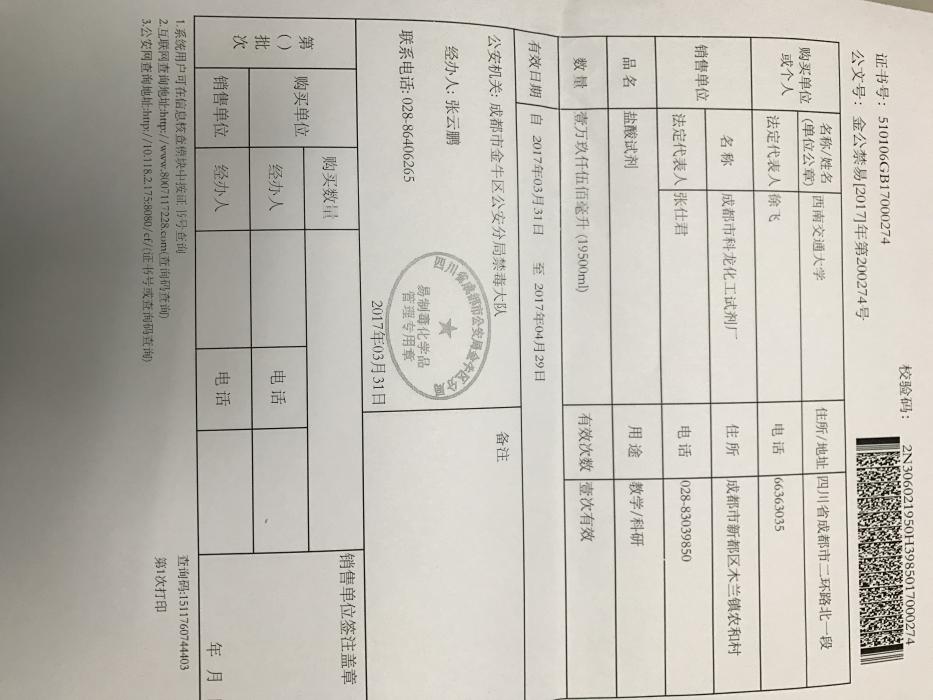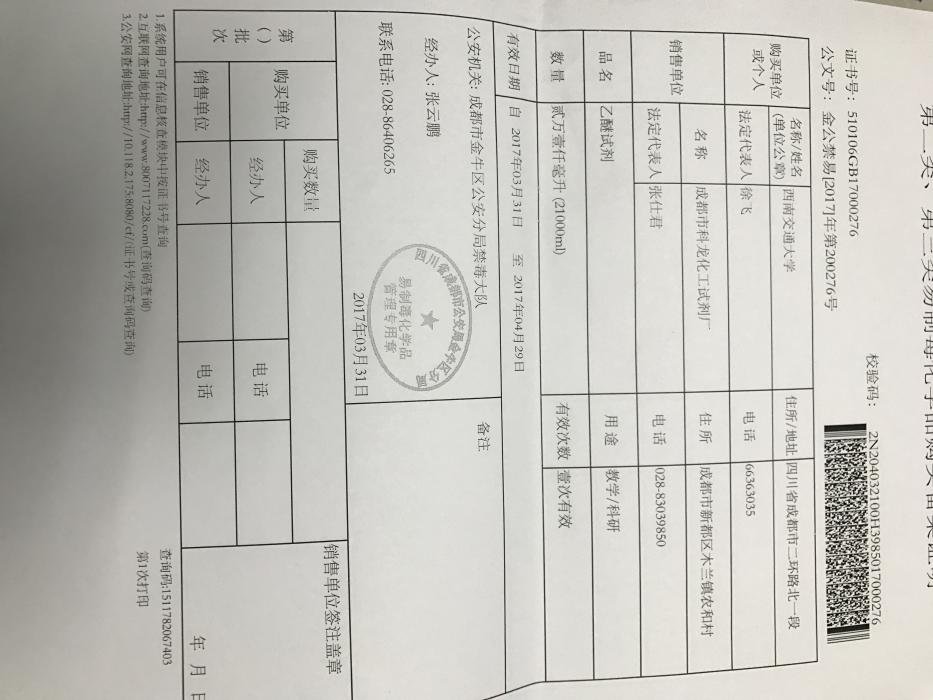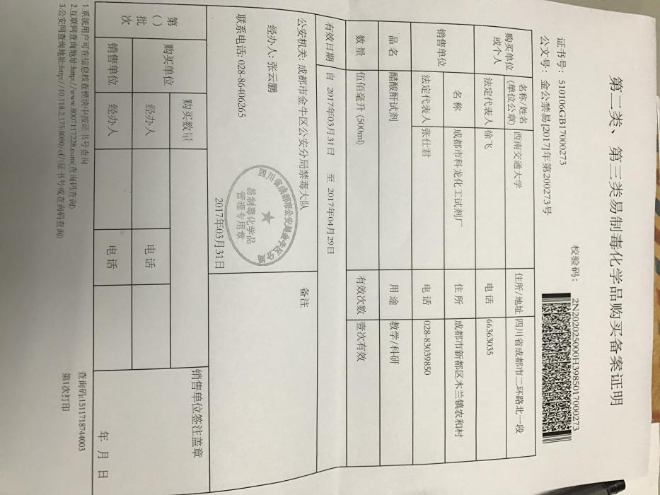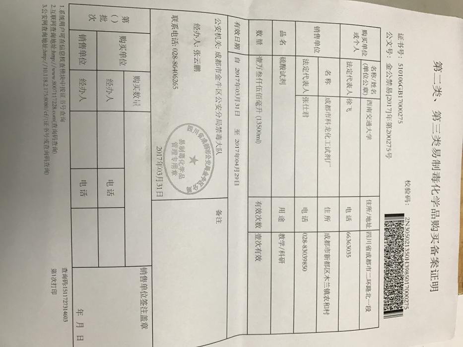根据各位老师上个月提交的购置申请,目前已经依次完成资实处审核、保卫处审核、公司备案、与销售单位签订合同等环节,由资实处通过四川省易制毒化学品管理系统向公安部门申请到了所需的配额(备案证明见附件),备案证明的有效期为一个月(3.31-4.29),所有老师的购买必须在此规定时间内一次性完成。